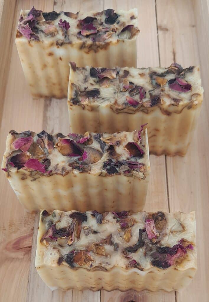 Deze zeep is verrijkt met gemalen rozenblaadjes en Rozen-Geranium etherische olie.